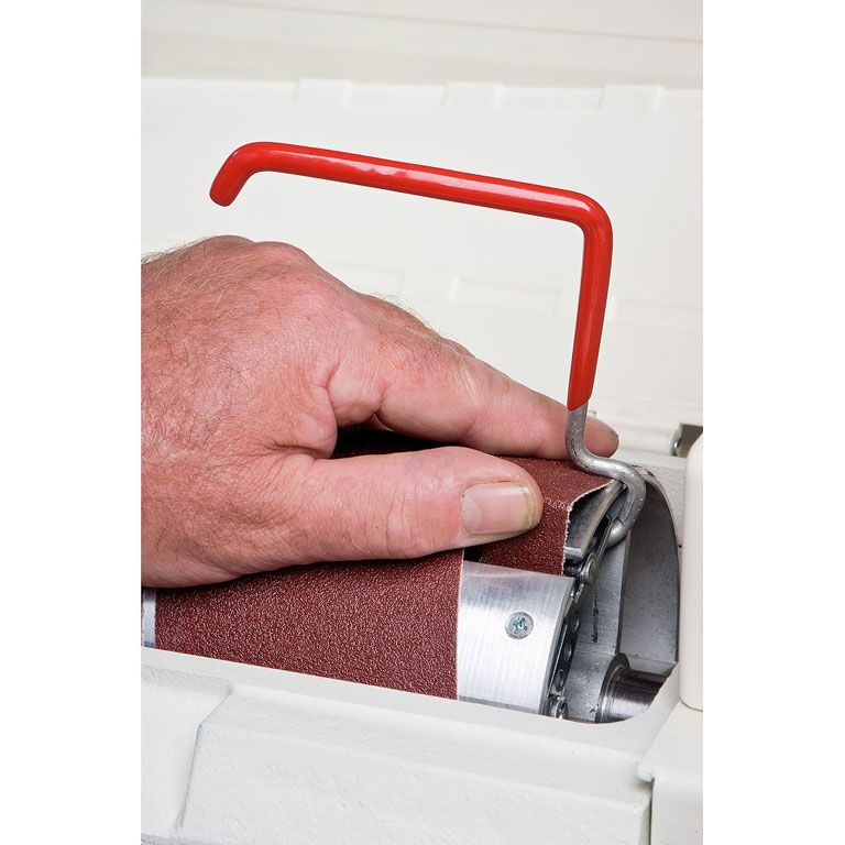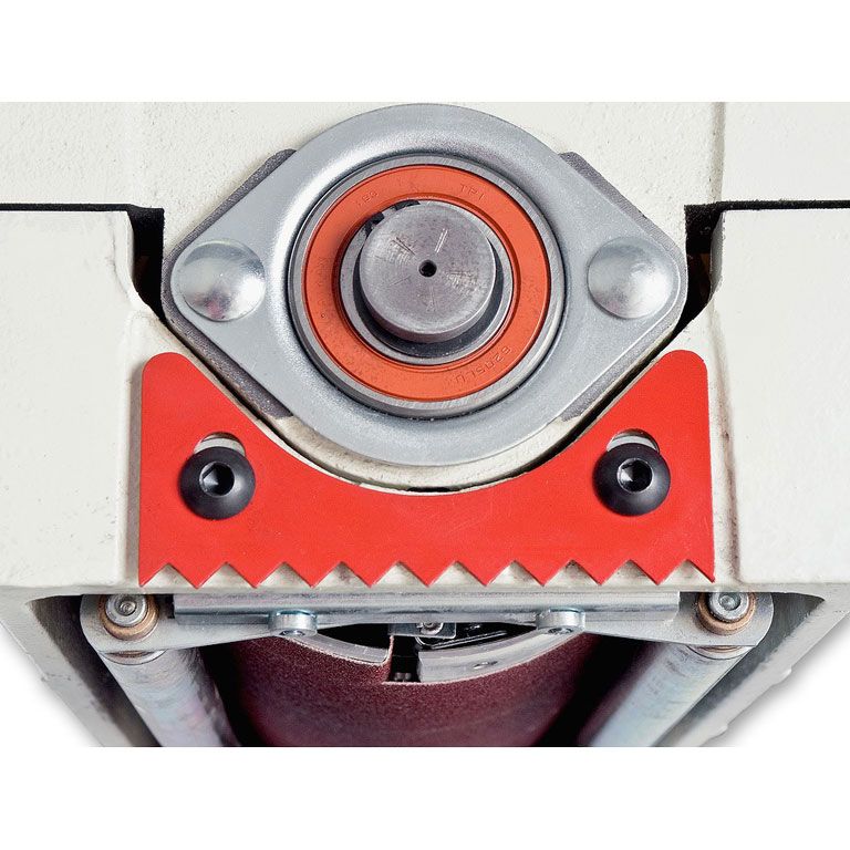 Предусмотрены все необходимые настройки: высоты установки барабана (маховиком сверху) и скорости подачи (плавная при помощи электроники). Центровка ленты транспортера производится специальными винтами и обычно требуется только после замены. Основной расходный материал – абразивная лента шириной 75 мм, она наматывается на барабан, концы фиксируются в зажимах.