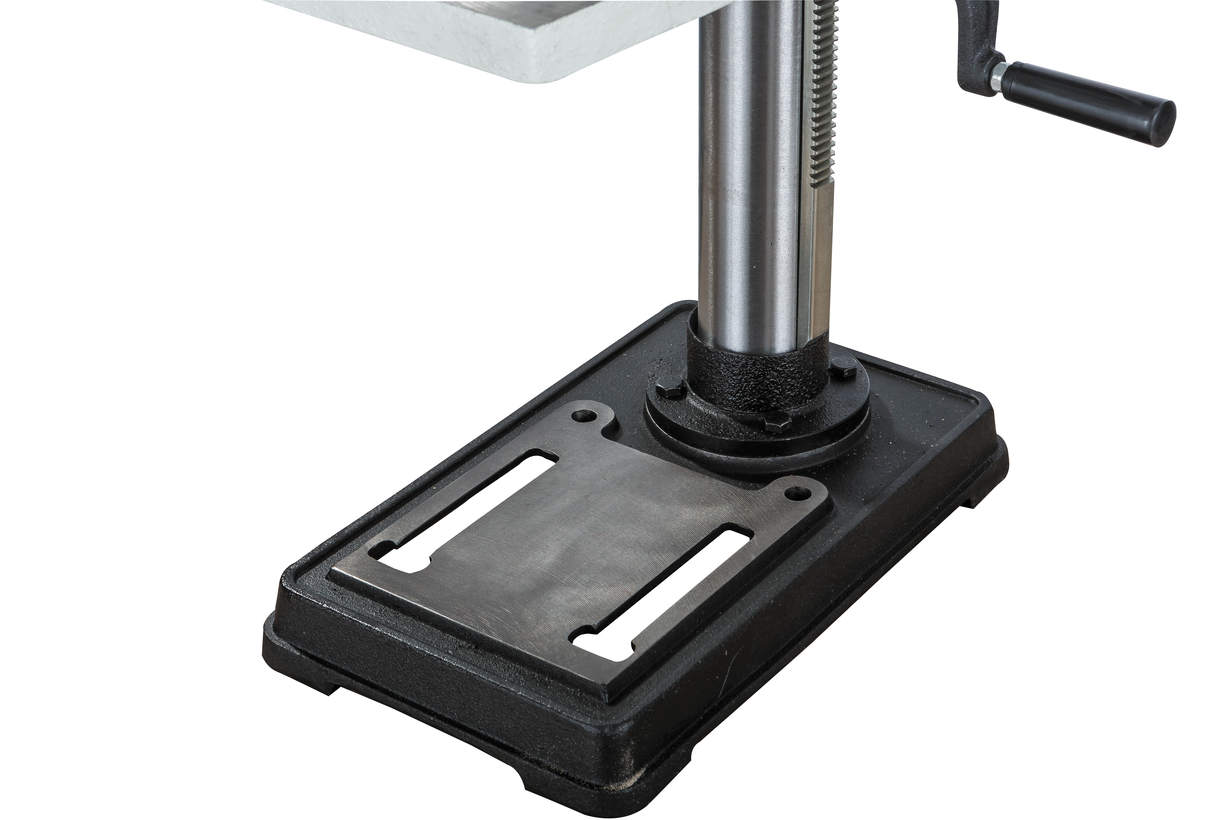 Рукоятка привода пиноли оборудована лимбом для контроля подачи и имеет встроенный ограничитель хода (глубины сверления). В штатный комплект поставки входят станочные тиски Wilton, для крепления которых предусмотрены пазы на столе и на опорном основании станка.