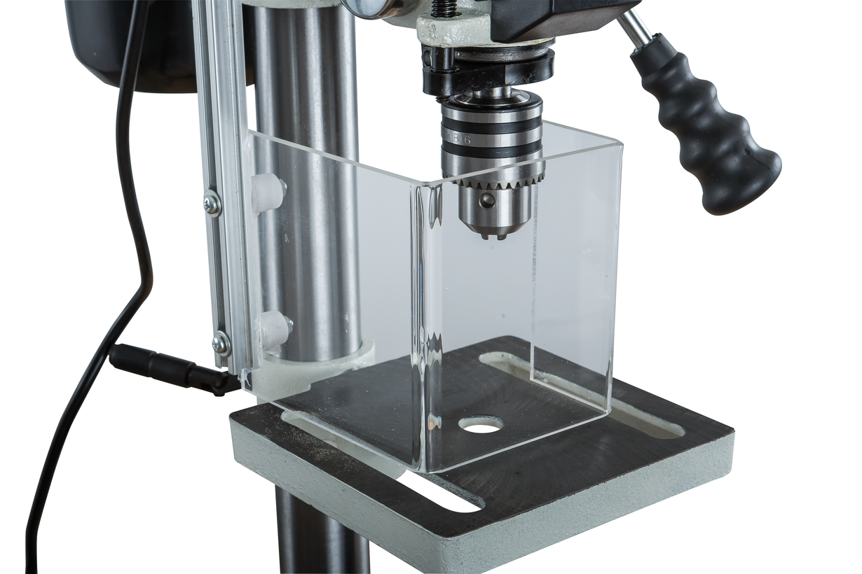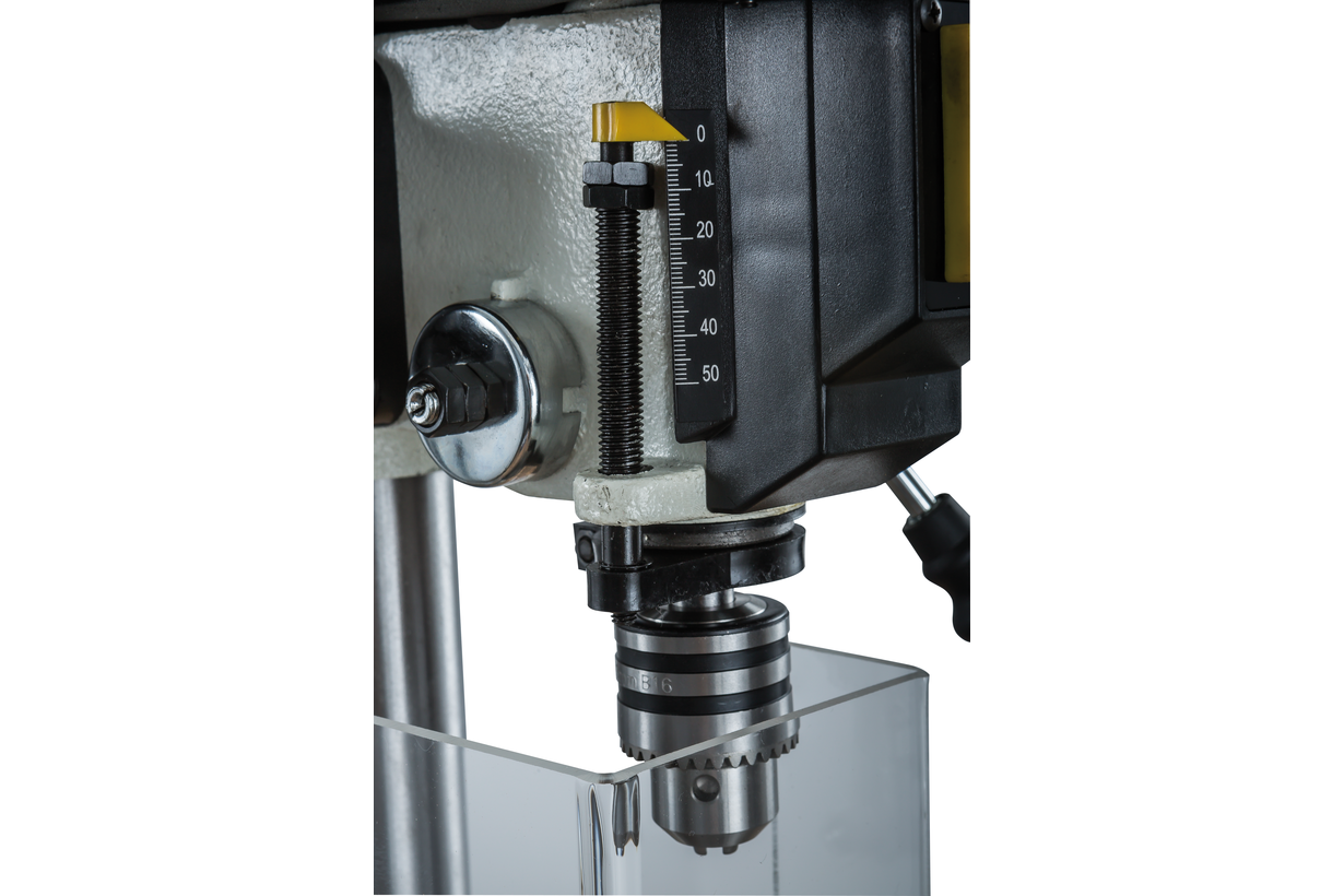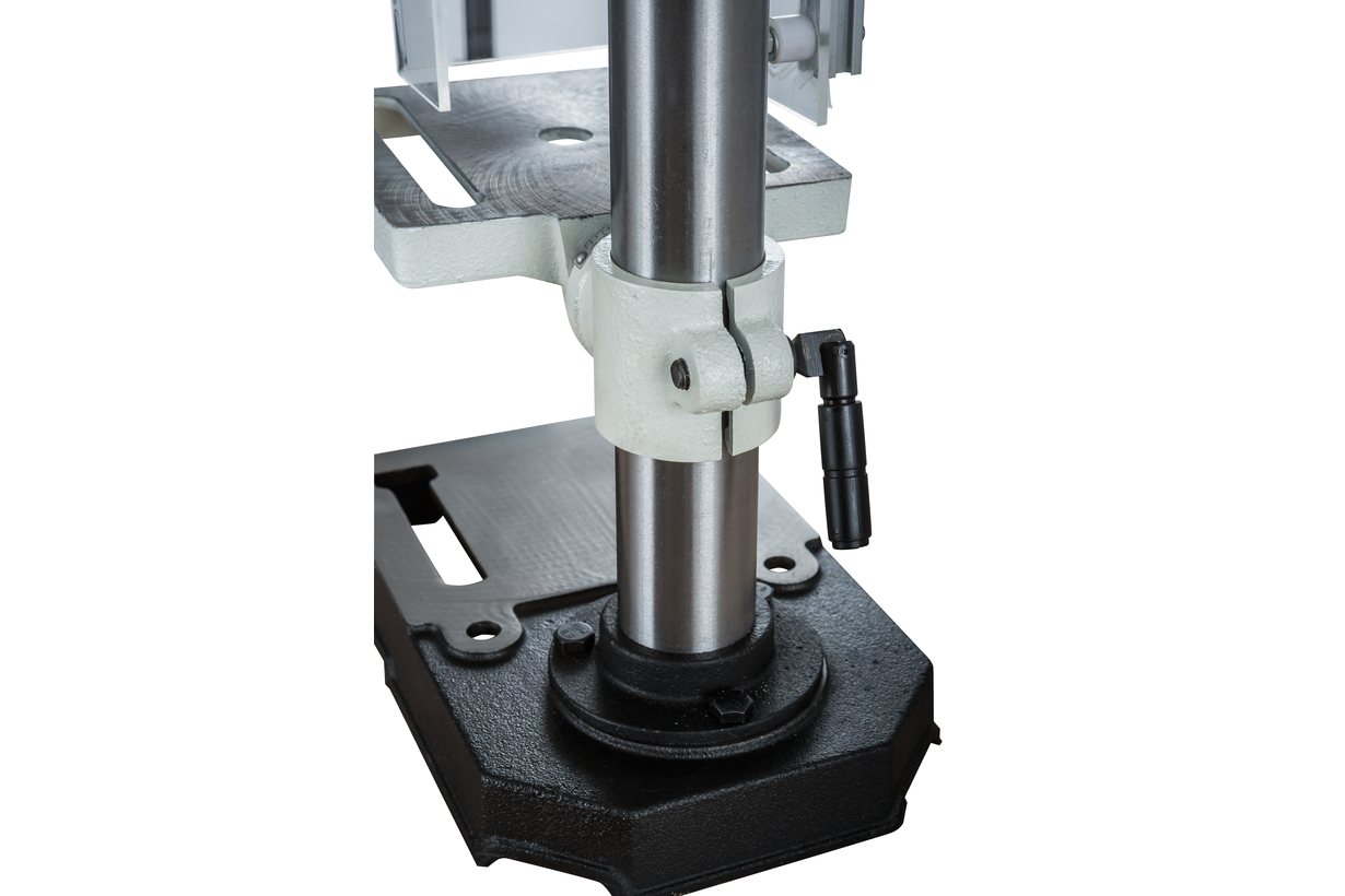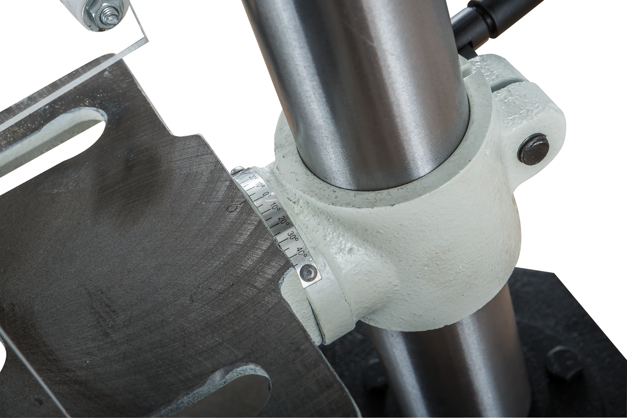 Пиноль шпинделя оборудована резьбовым упором-ограничителем, это простой в настройке и точный механизм, позволяющий производить установки с помощью штангенциркуля, или просто отсчитывая обороты гайки. Заготовку размещают на регулируемом чугунном столе. Он поворачивается вокруг горизонтальной оси, перемещается вверх и вниз по колонне, а если потребуется разместить крупную заготовку, может быть отведен в сторону разворотом на колонне. В таком случае опорой выступает верхняя поверхность подставки станка, отфрезерованная в плоскость, перпендикулярную оси сверления.
