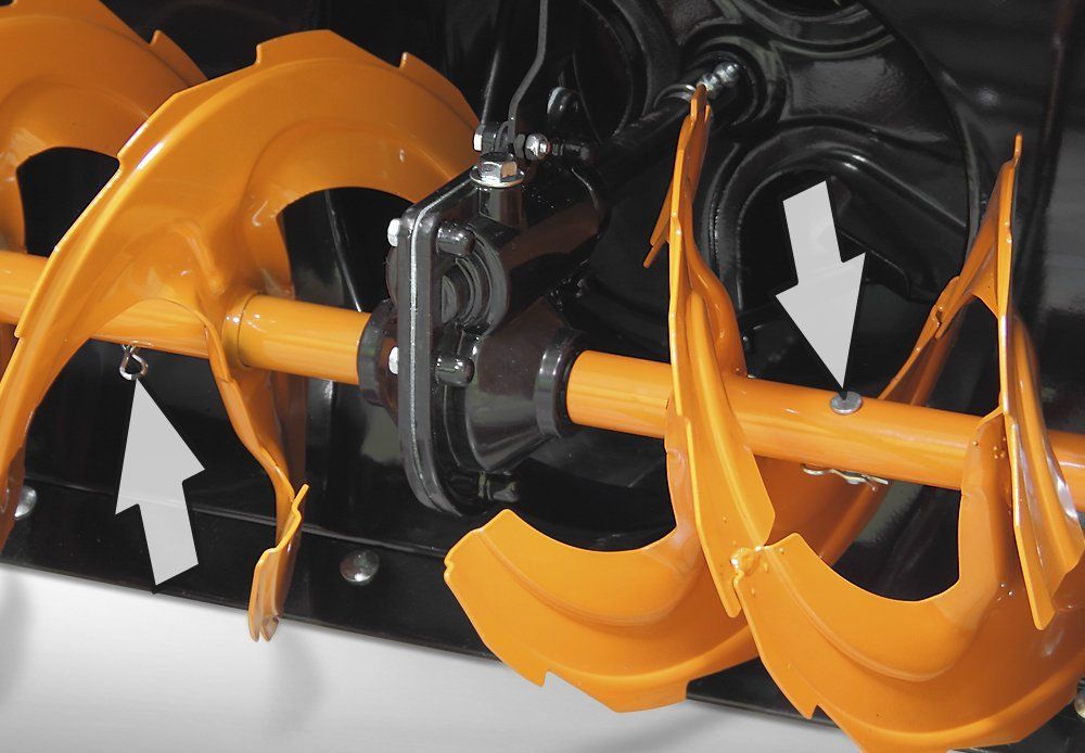 - Регулируемые по высоте полозья позволяют работать на неровных поверхностях и предотвращают повреждение снегоуборщика.